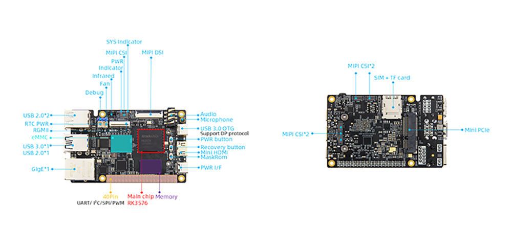 4. Onboard Gigabit Ethernet port, RGMII, USB3.0/2.0, Mini PCle, Mini HDMI, MIPI screen and MIPI camera and other peripheral interfaces, leading out 40Pin unused pins, rich expansion interfaces to meet more development needs!